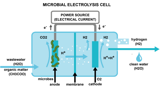 Sounds like great news but how is hydrogen produced from wastewater? Researchers used microbial fuel cells (MFC) based on the process of microbial decomposition of organic material. The process involves attaching electron-transferring microorganisms, or exoelectrogens to an anode (i.e. the negative terminal in a battery) within a reactor material. Electrons are then diverted to an oxygenated cathode (the positive terminal of the battery). This process has been used to treat wastewater since 1991. However, it produces that global warming inducing gas, carbon dioxide (CO2), and electricity. So how can be this good to cut emissions? Here is the novelty element: by adding an external electrical current to the MFCs, and creating a microbial electrolysis cell (MEC), hydrogen can be produced during the treatment of wastewater.
